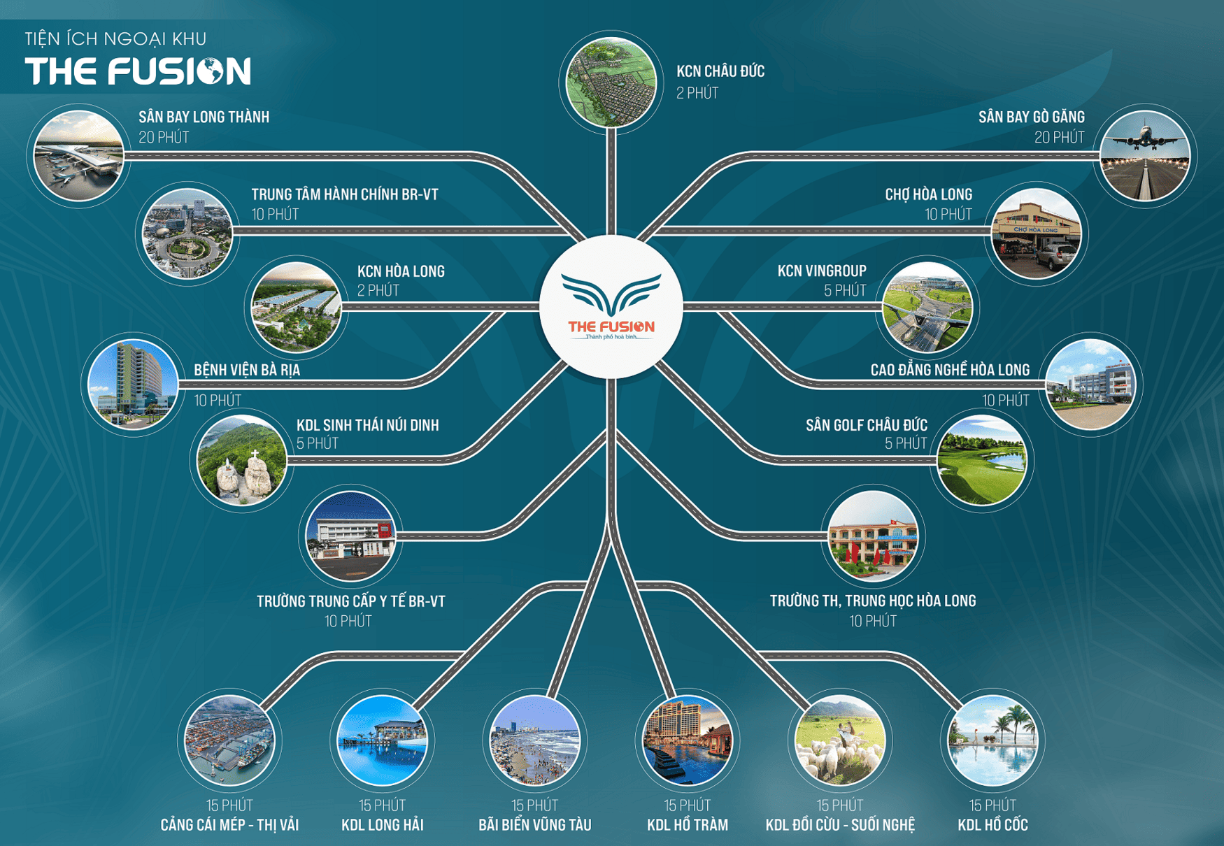 - 10 phút: Trung tâm hành chính BR-VT, Bệnh viện Bà Rịa, Chợ Hòa Long, Trường trung cấp y tế BR-VT, Trường học các cấp Hòa Long.