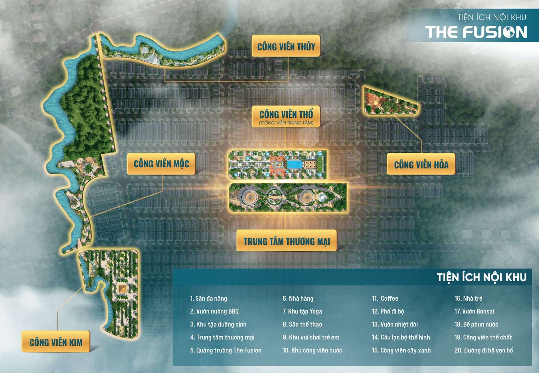 - Giải trí & Mua sắm: Trung tâm thương mại (Fusion Mall), Quảng trường The Fusion, Phố đi bộ, Nhà hàng, Coffee.